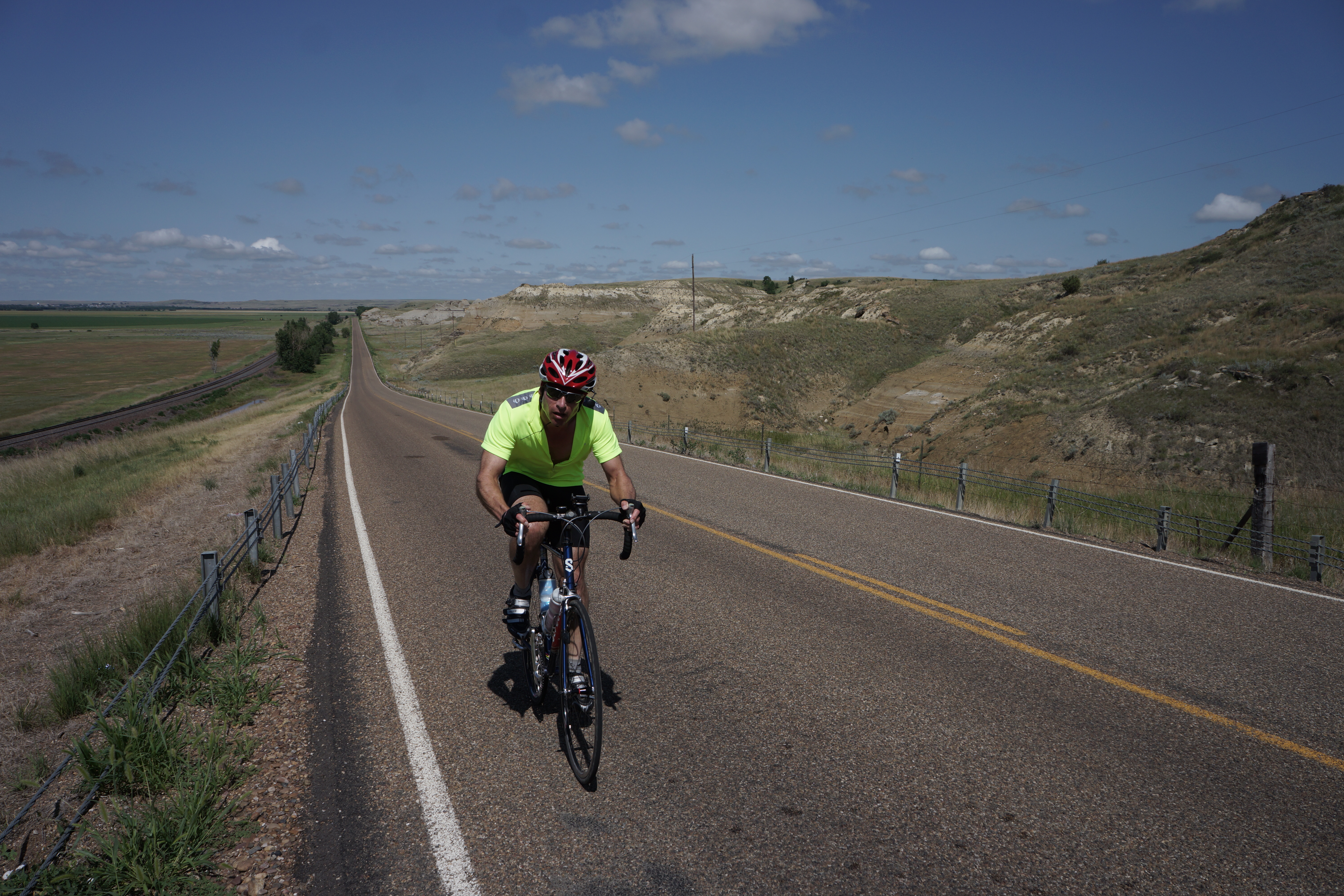 Mile 51: A real shocker – being ahead of Doug (probably because he had a flat tire – I can think of no other reason I ever got ahead of him) and getting his photo climbing a hill on B1A on the Fort Peck Indian Reservation.
