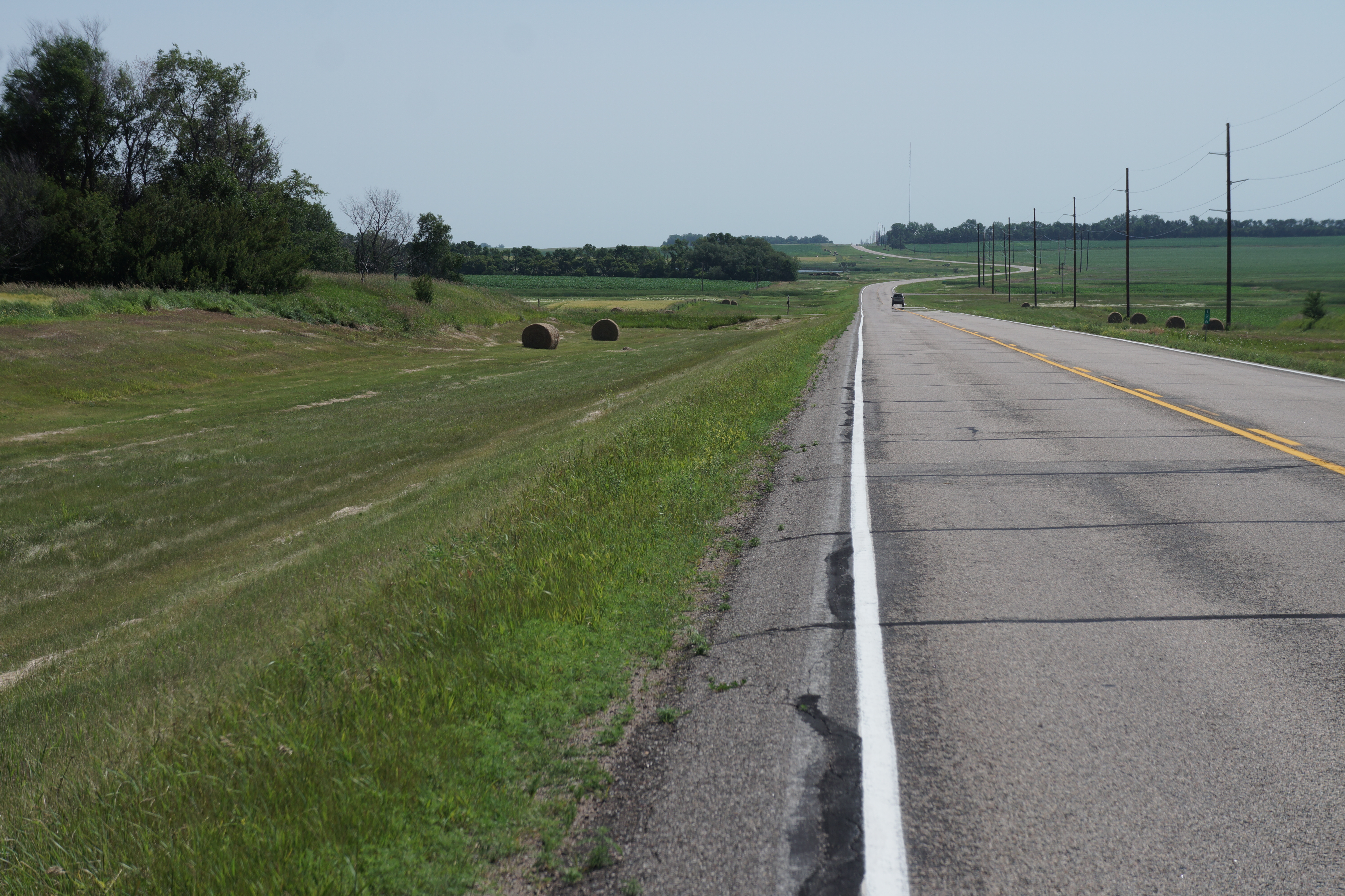 Mile 52: View east on Route 2 approaching Ross, ND. Note: Wide shoulder for biking, but numerous stones and debris which must be avoided.