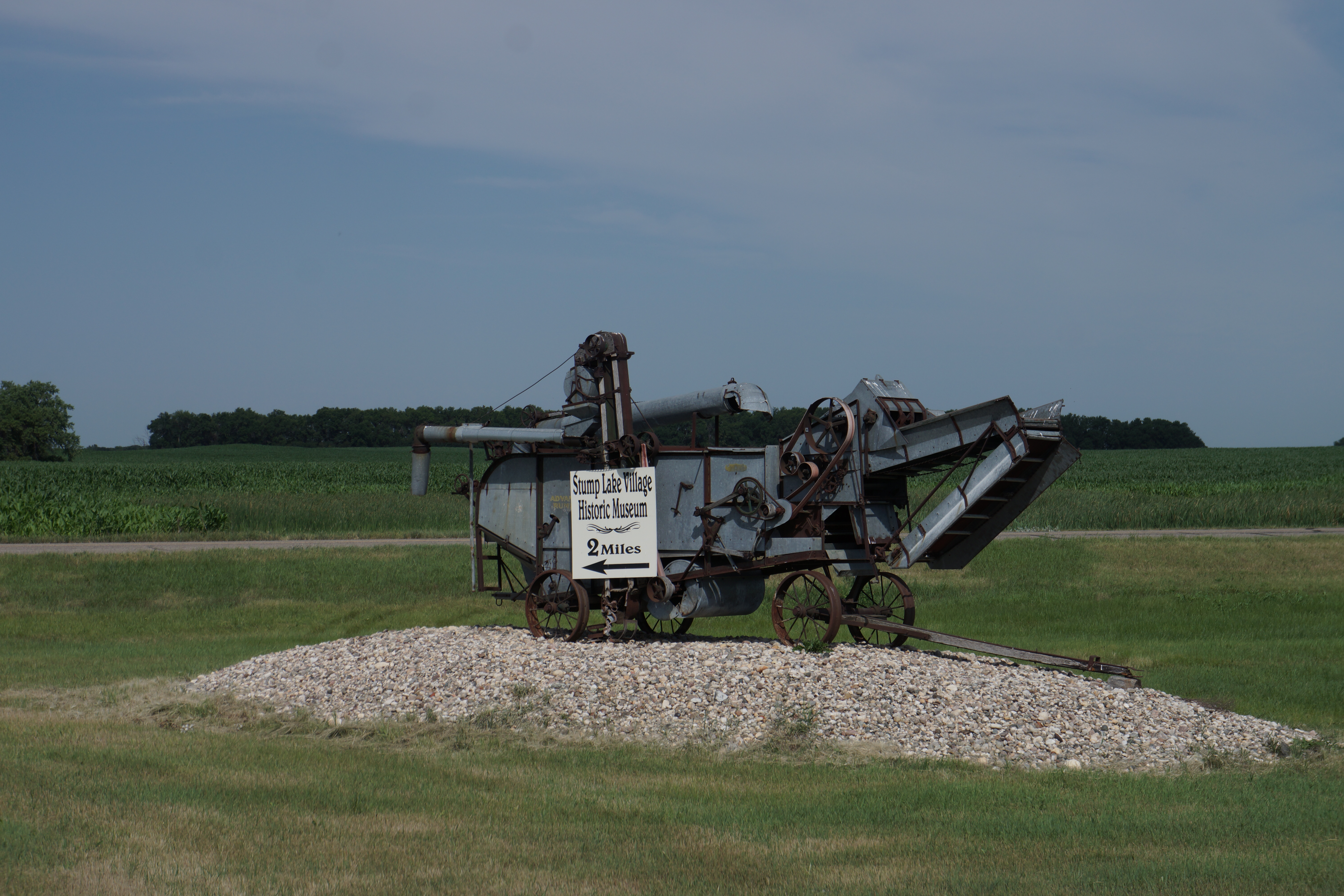 Interesting day of sightseeing – visited 3 notable sites: 1) Rugby, ND – The Geographical Center of North America (see photo above), 2) Towner, ND – The Cattle Capital of North Dakota (see photo below), 3) The World’s Largest Metal Belt Buckle at the Prairie Village Museum in Rugby, ND (see photo below). Nothing new in terms of terrain or scenery. However, I did see my first crop duster in a field I passed (fortunately, I was upwind).