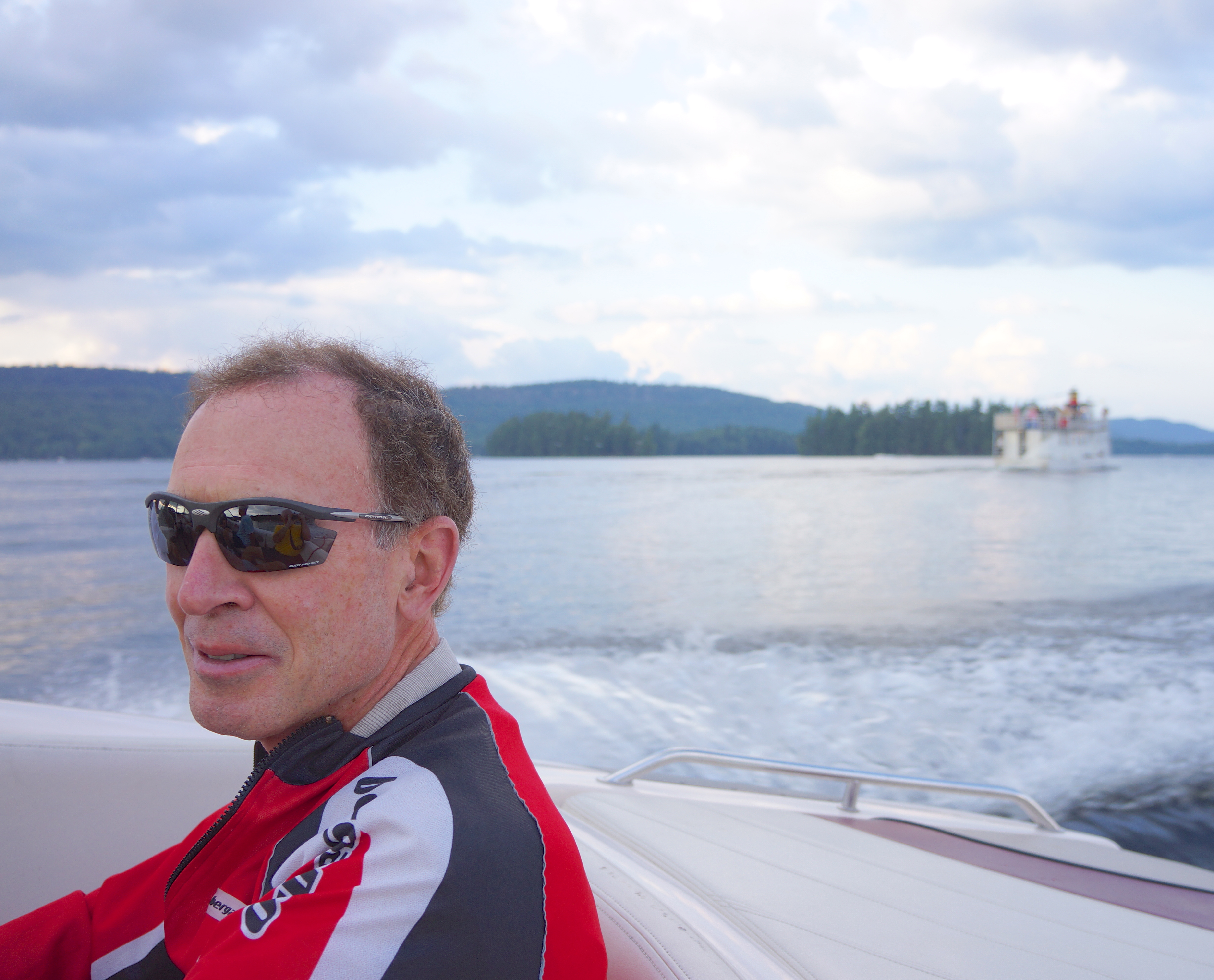 All bad weather was forgotten as my friends Nancy and Steve graciously hosted Doug, Robert, Jim and me at their vacation home near Old Forge for the evening. The sky cleared, we took a boat ride on First, Second, and Third Lakes, met their dog, Parker, had our first delicious home cooked meal in nearly two months topped off with great wine, and exchanged stories of our trip and the Andirondacks. Thank you Nancy and Steve.