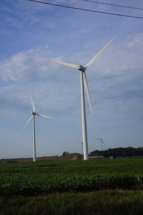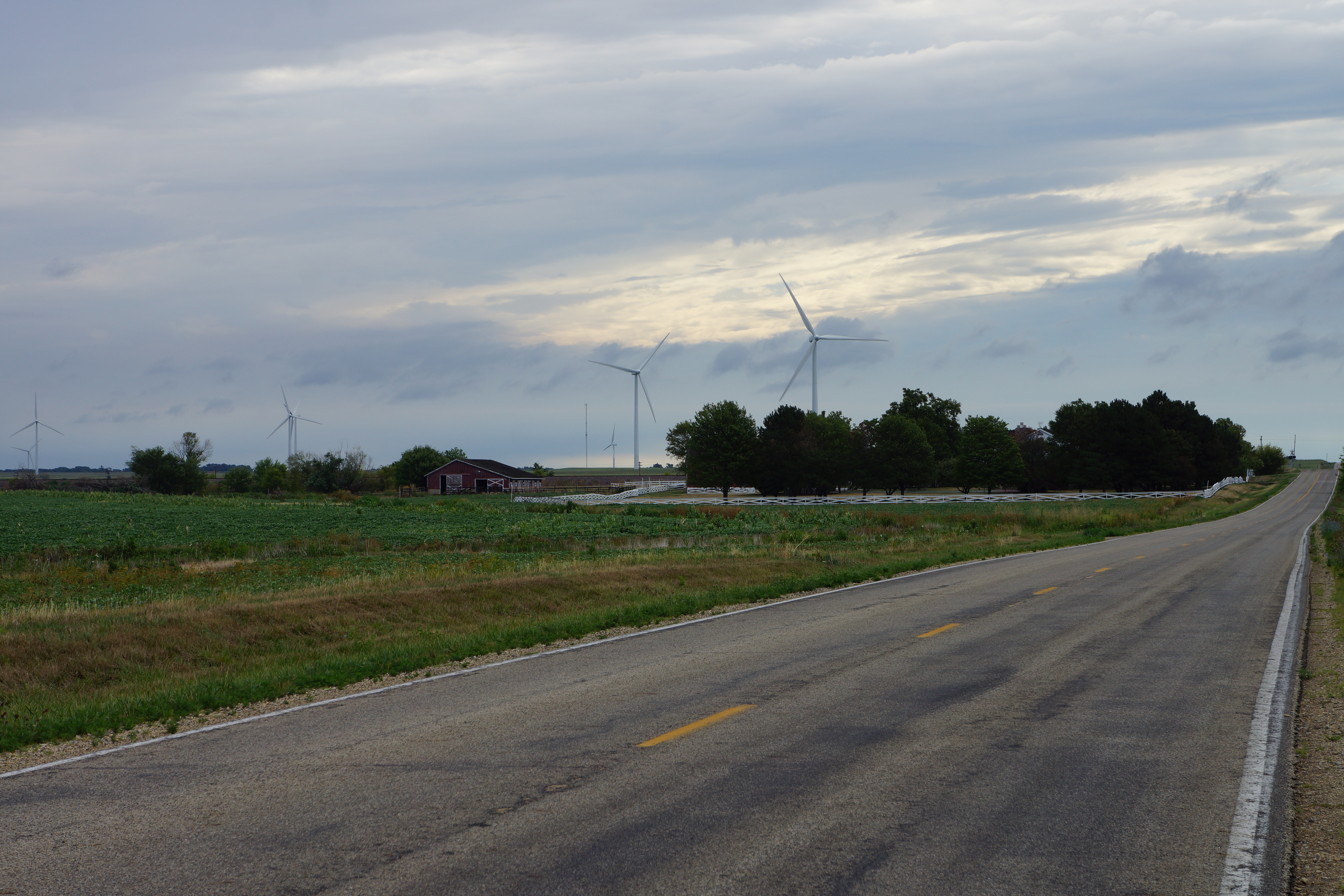 Mile 67: While we passed two windmill farms in Montana and North Dakota, this one near Cambridge, IL was huge in comparison to the other two. It appeared to have hundreds of windmills spread over dozens of square miles. While at first we were surprised how many windmills were not working, it became clear as we biked it was because they were being constructed. As we continued east on Route 570N we began to see the the original windmills in operation.