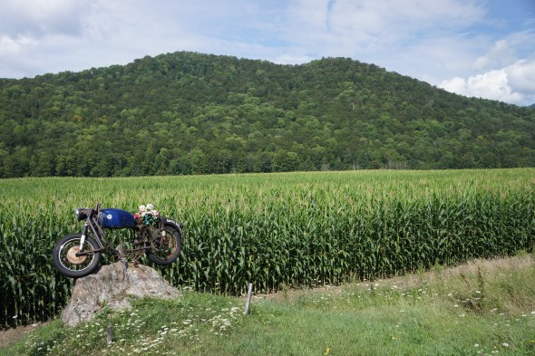 I stopped to take this photo of a strange monument, an antique motorcycle mounted on a rock. A man from a house across the street from it called me over to explain it. A good friend who was a BMW motorcycle mechanic died in his sleep several years ago when he was 50. In his honor his friends took one of his motorcycles and mounted it on the side of the road as a memorial to him.