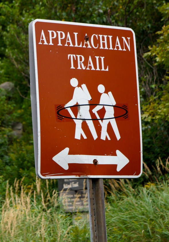 Appalachian Trail Marker at the top of the pass . When we arrived we found a dozen college age hikers resting or hitchhiking the six miles into town. One group of six hikers told me that they had been hiking the Appalachian since February when they started in Georgia and were going to complete the trip in September.